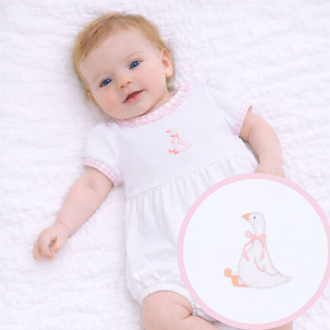 Crafted from sumptuous Pima cotton, this charming one-piece bubble showcases hand-embroidered goose detailing and graceful...