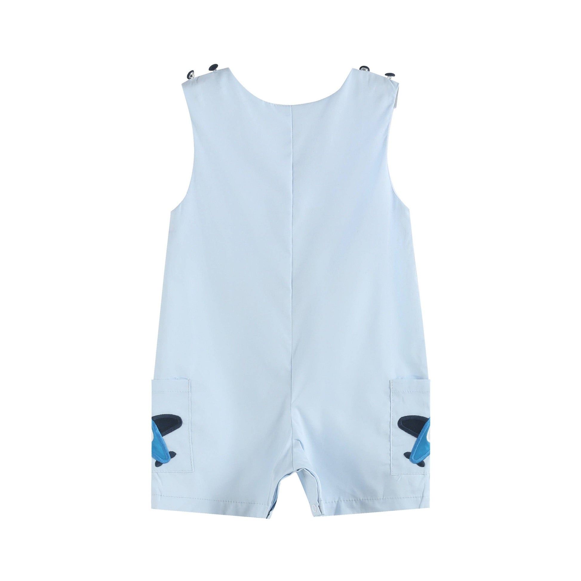 Fly into style with our Blue Airplane Pockets Shortalls. With charming appliqué airplanes and adorable pockets, your little pilot is set for stylish adventures. Featuring cloth-covered buttons for adjustable comfort and convenient snaps for easy changes. Ready for takeoff in style!