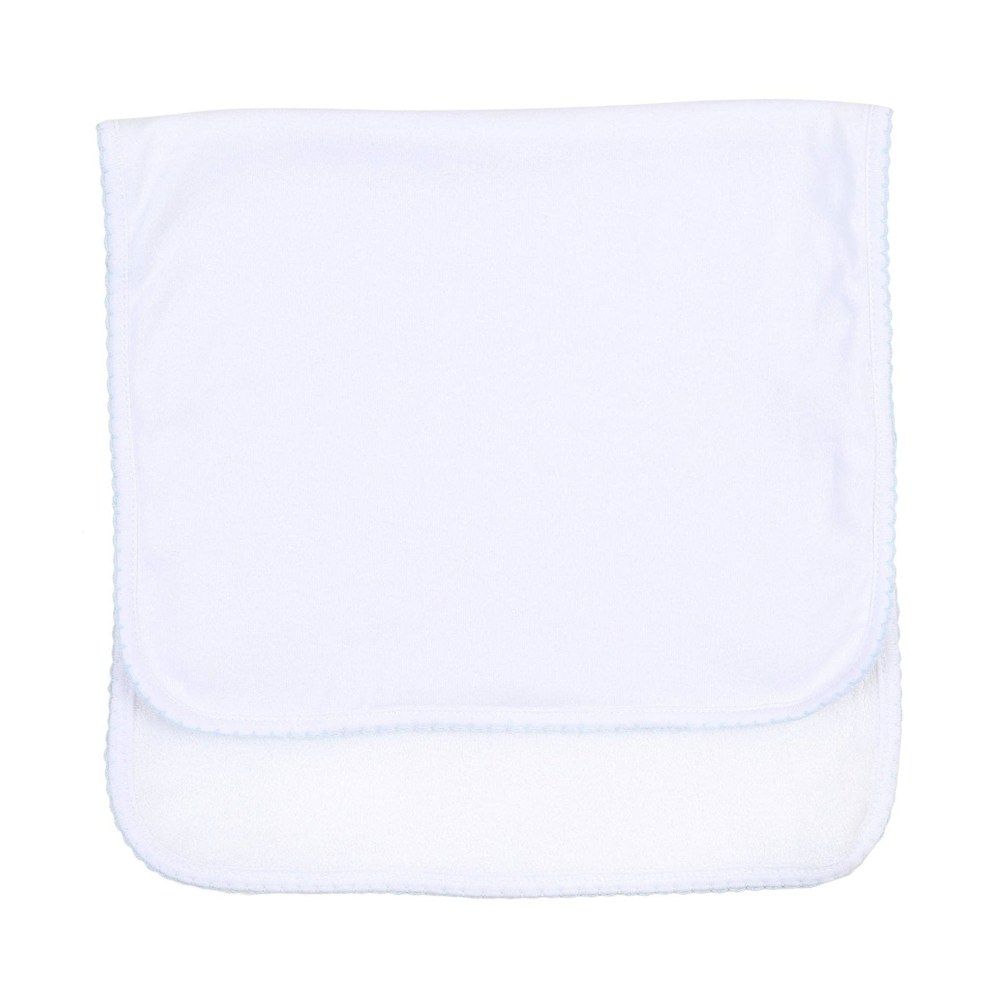 Sweetest comfort for little moments. Our Magnolia Baby Essentials Blue Trim Burp Cloth offers the gentle touch of pure pima cotton, perfect for after-feeding cuddles. The soft blue trim adds a classic Magnolia Baby charm. Absorbent, soft, and beautifully simple – an perfect blank for monogramming.