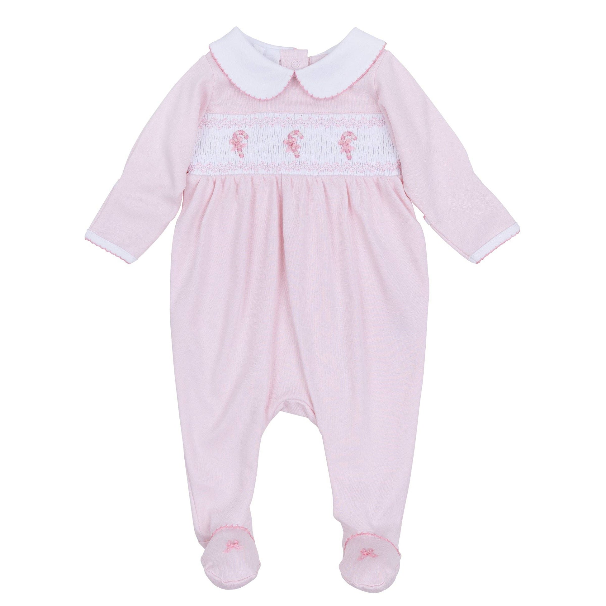 Celebrate the holidays with our Sweet Peppermint Smocked Footie. Inspired by sweet candy canes, this charming white footie, crafted from luxurious Pima Cotton, features hand smocking and delicate hand embroidery for an elegant and festive look.