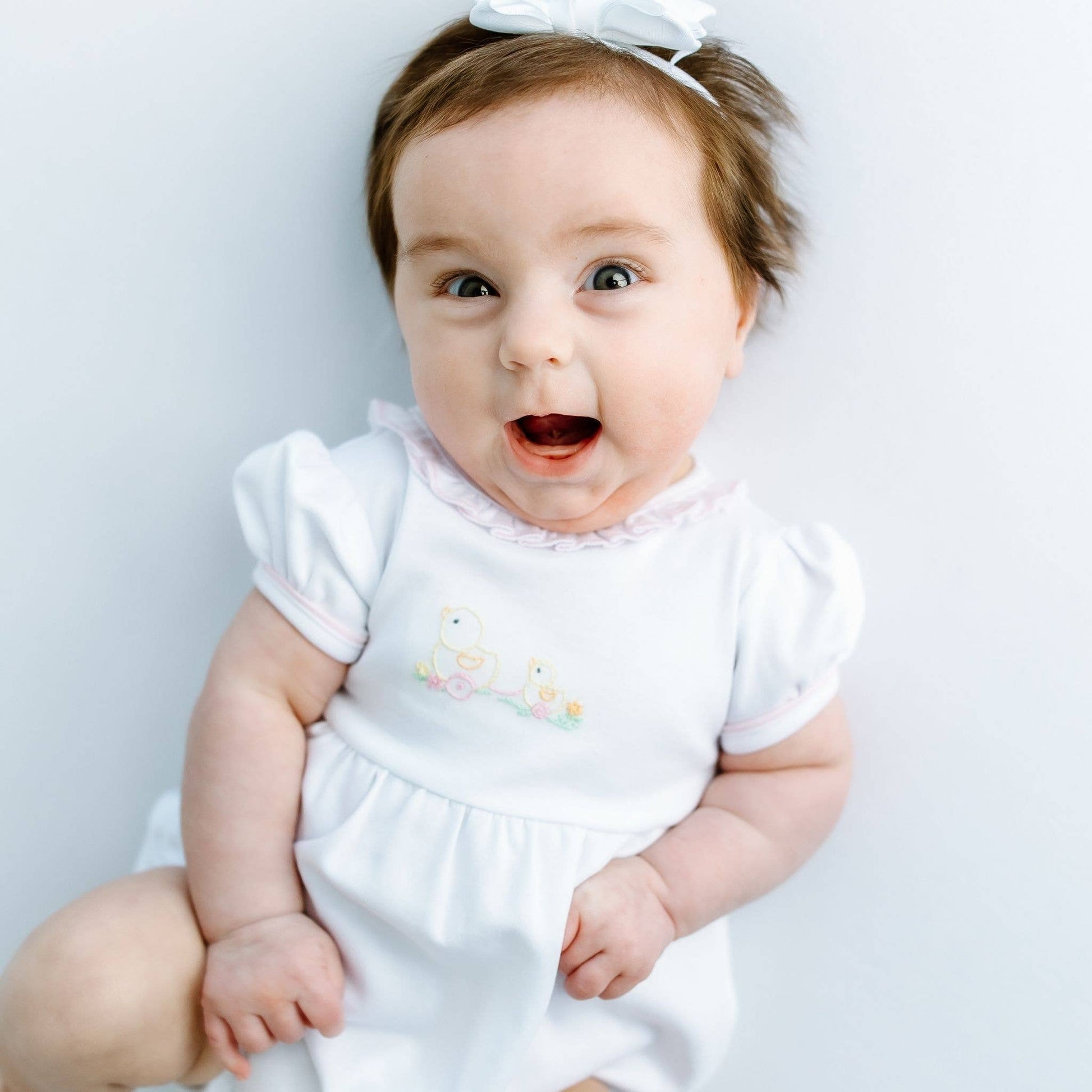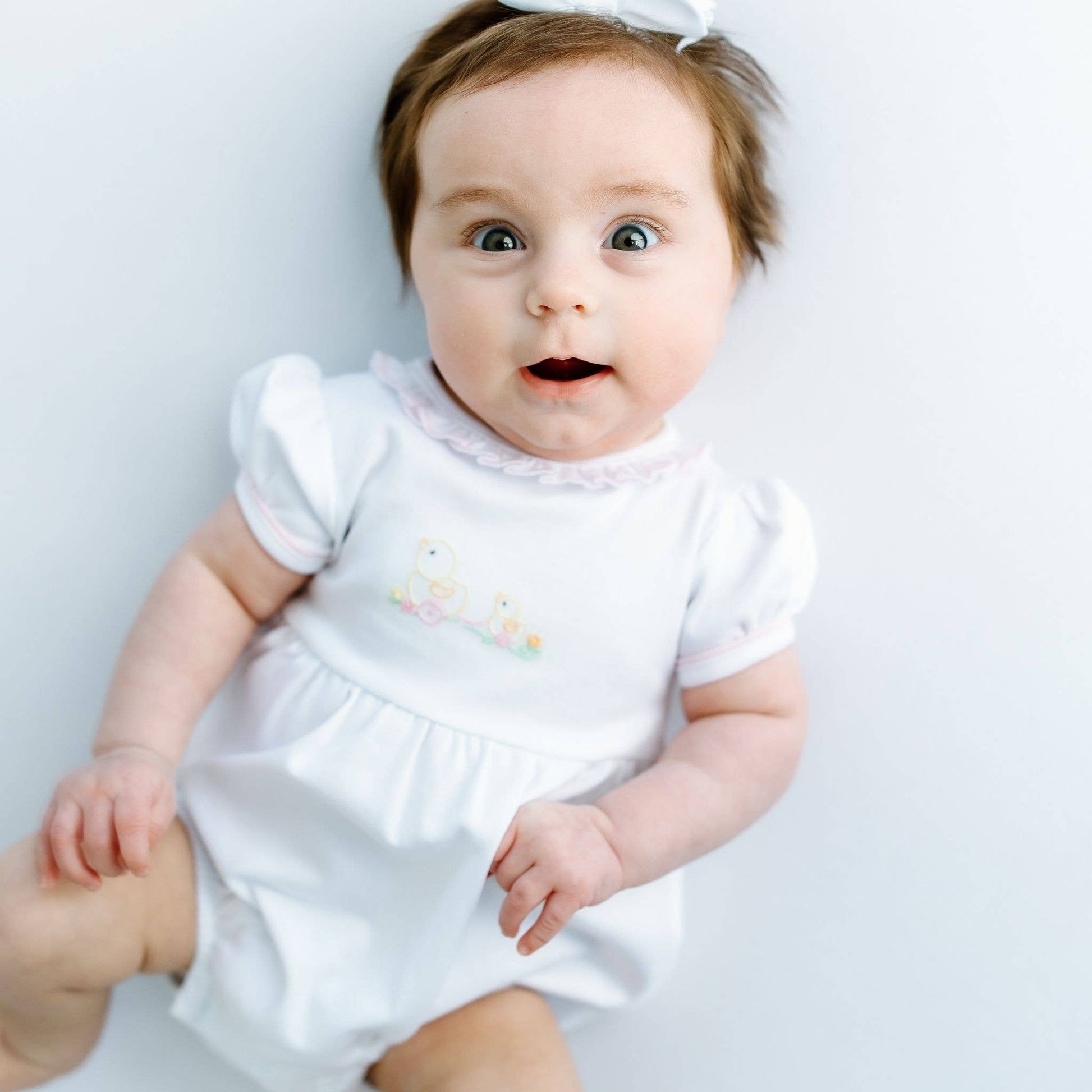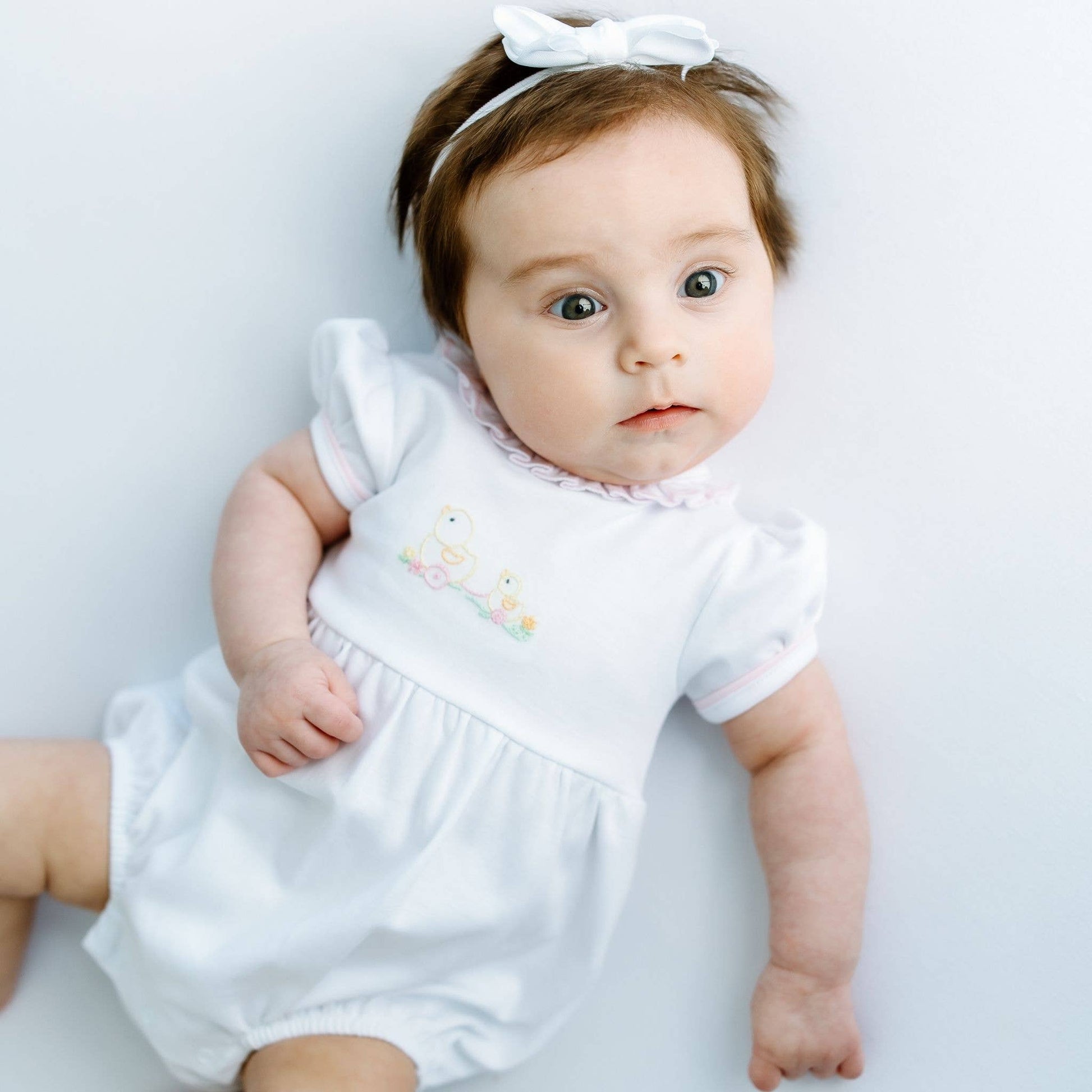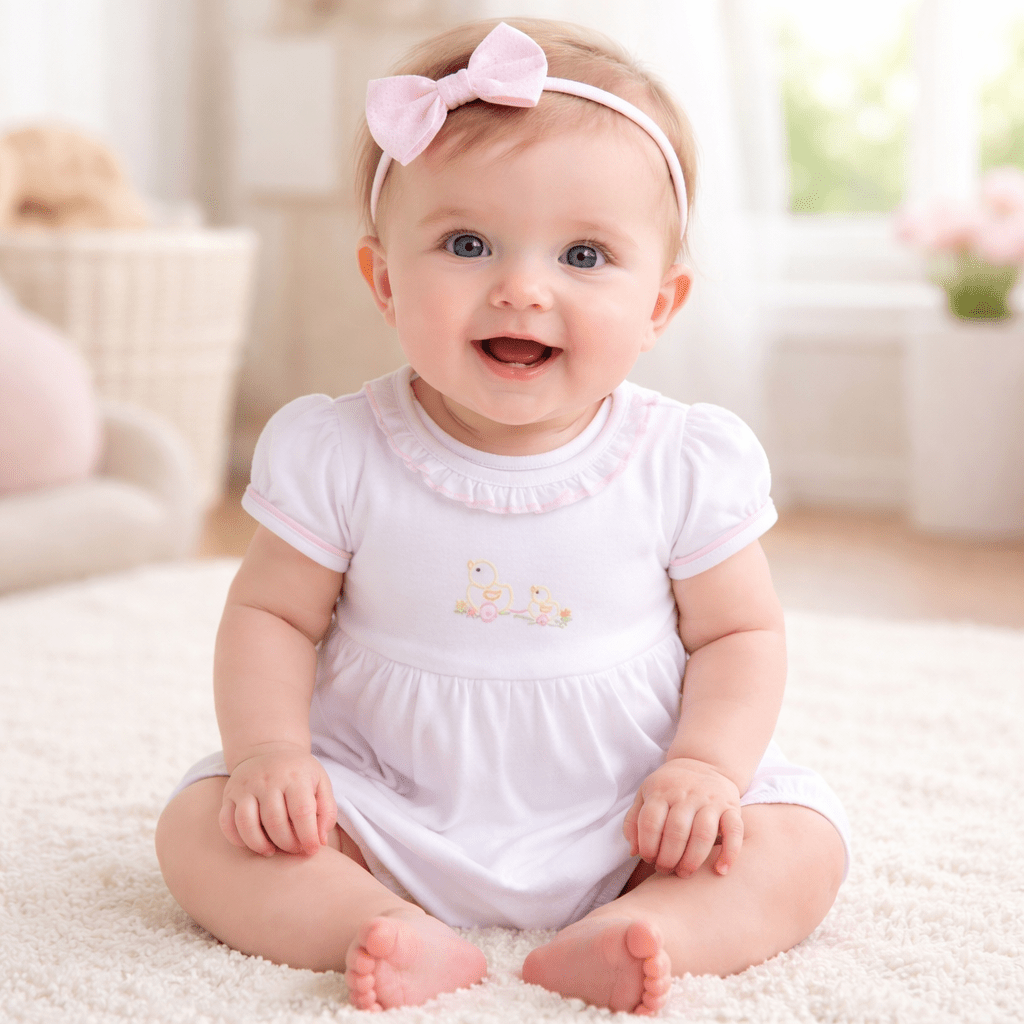 * Hand-Embroidery Detail: Features a delicate embroidered duckie.