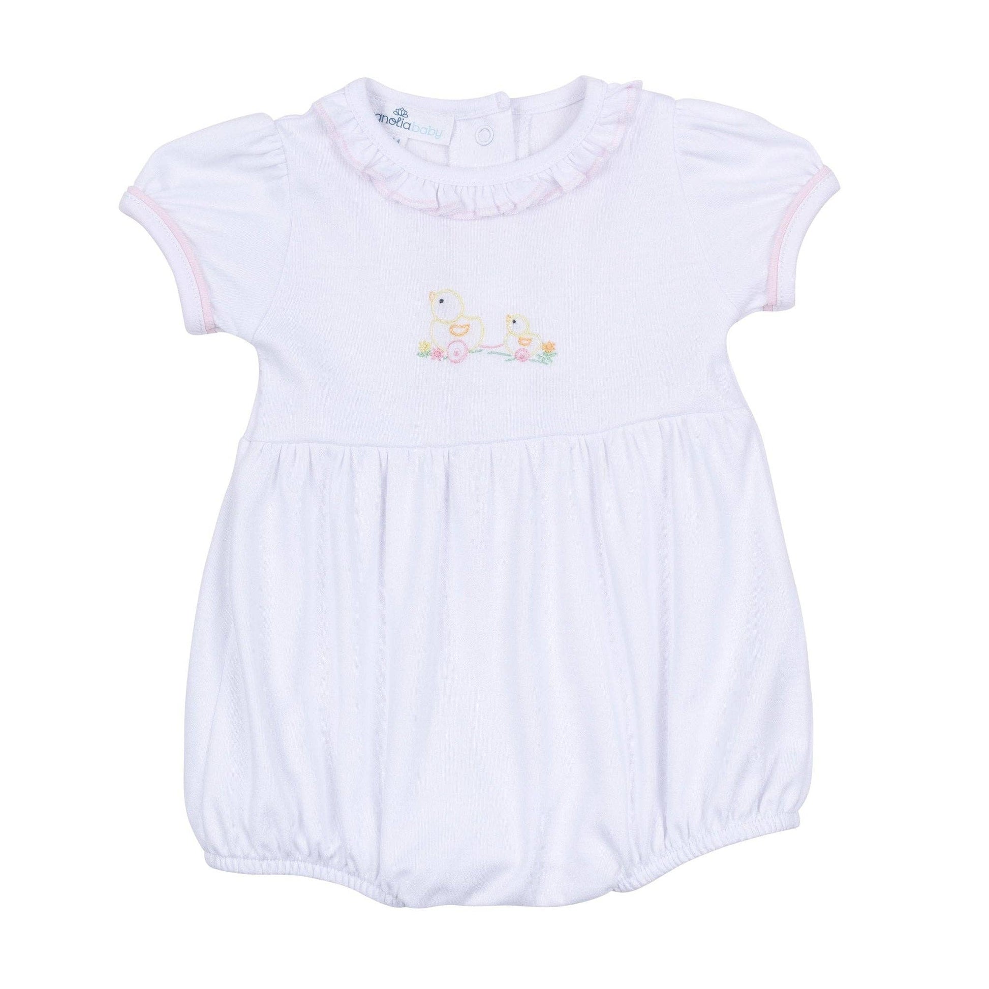A comfortable and classically styled all-in-one outfit designed for movement. Crafted from luxurious Pima Cotton for baby's comfort, this bubble features a whimsical hand-embroidered duckie and is finished with the charming pink checker trim.